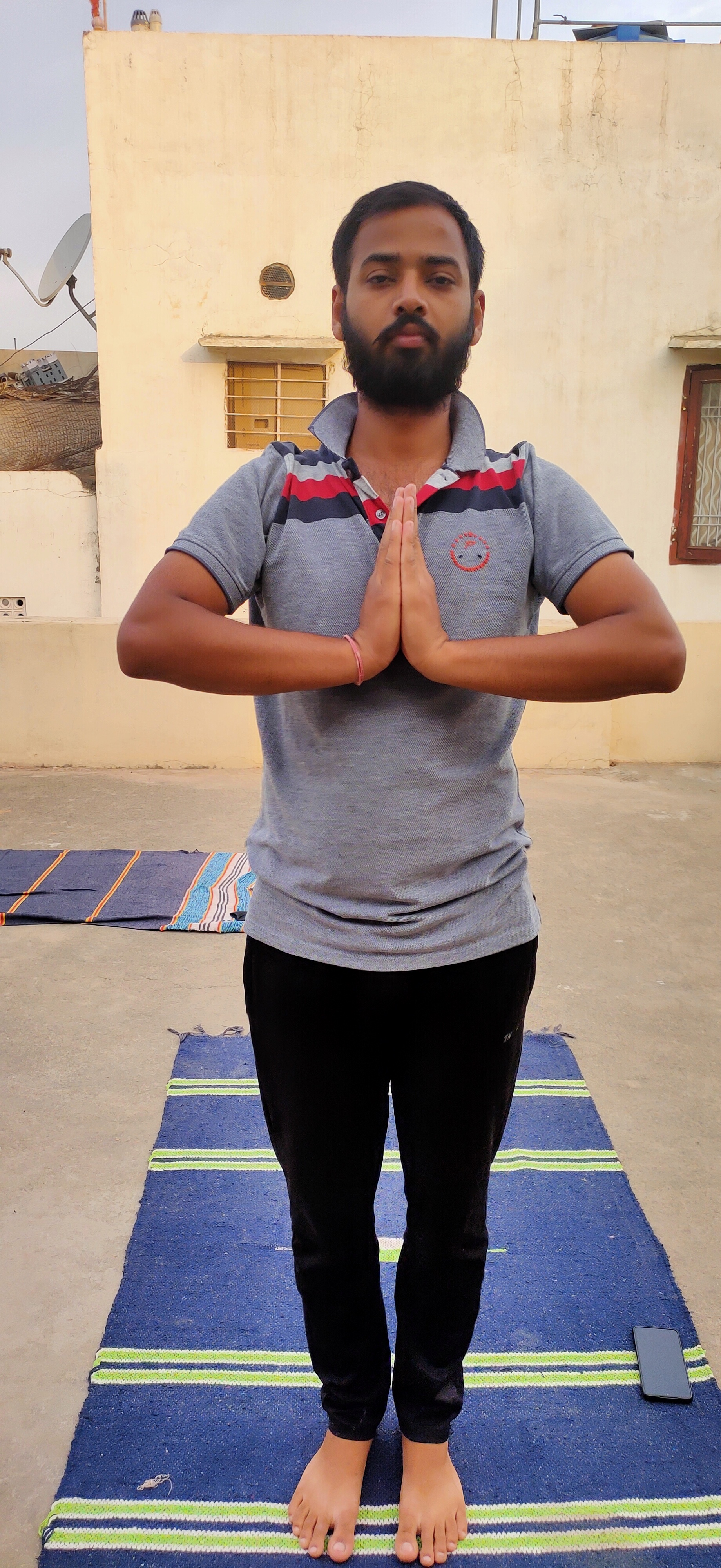 Stand at the age of your mat. keep your feet together and balance your weight equal on the both the feet. expand your chest and relax your shoulders. as you breathe in, lift both arms up from the sides, and as you exhale, bring your palms together in front of the chest in prayer position.