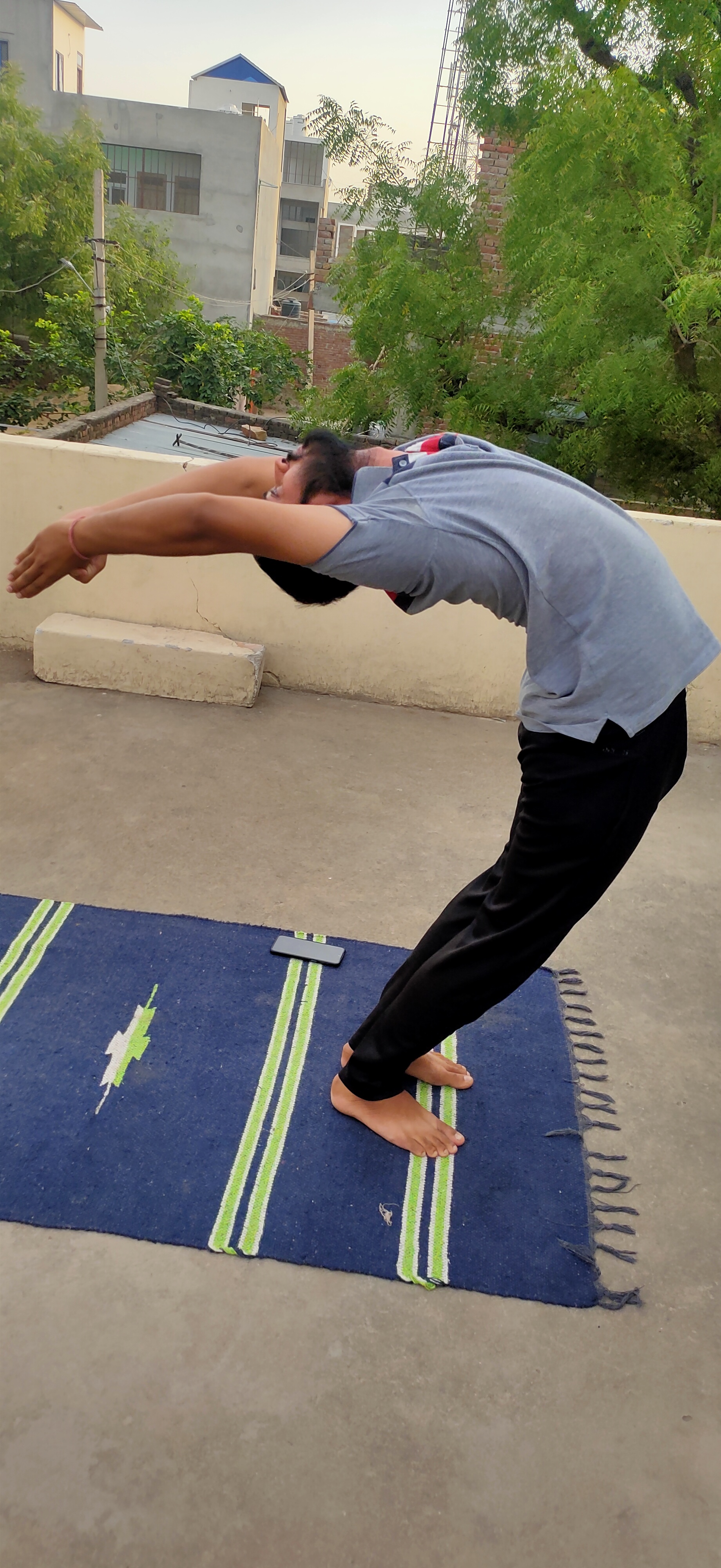 Breathing in, roll the spine up. raise the hands up and bend backward a little bit, pushing the hip slightly outward.