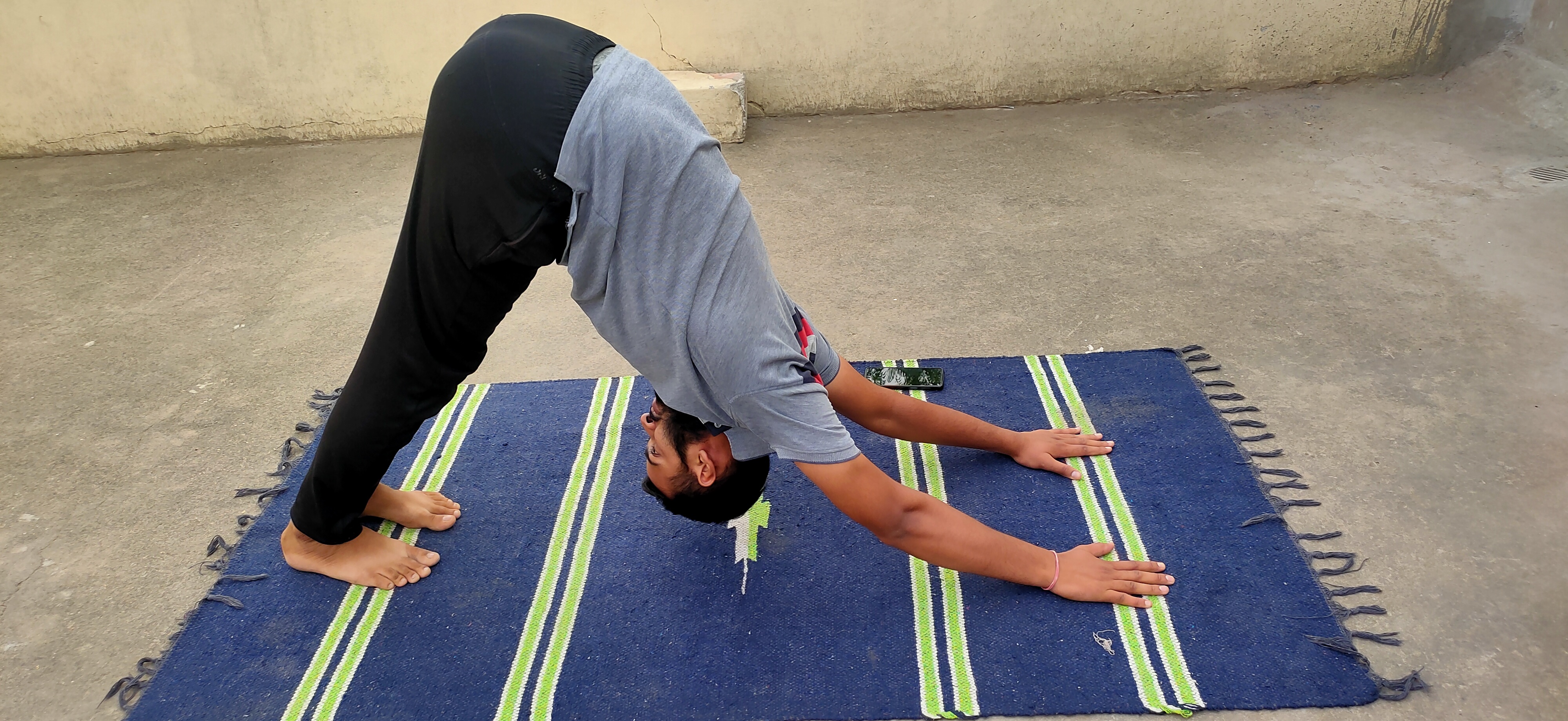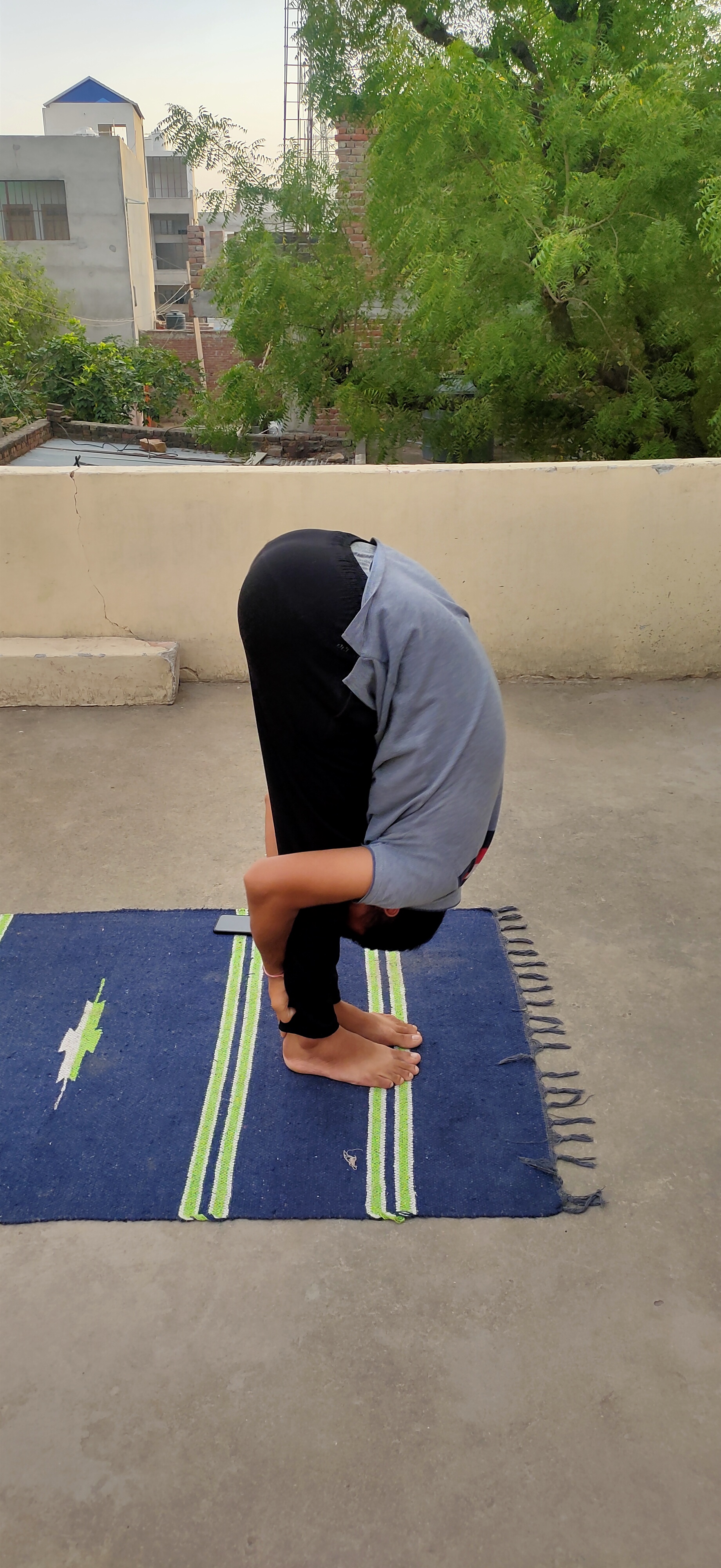 Breathing out, bend forward from the waist keeping the spine erect. as you exhale completely, bring the hands down to the floor beside the feet.