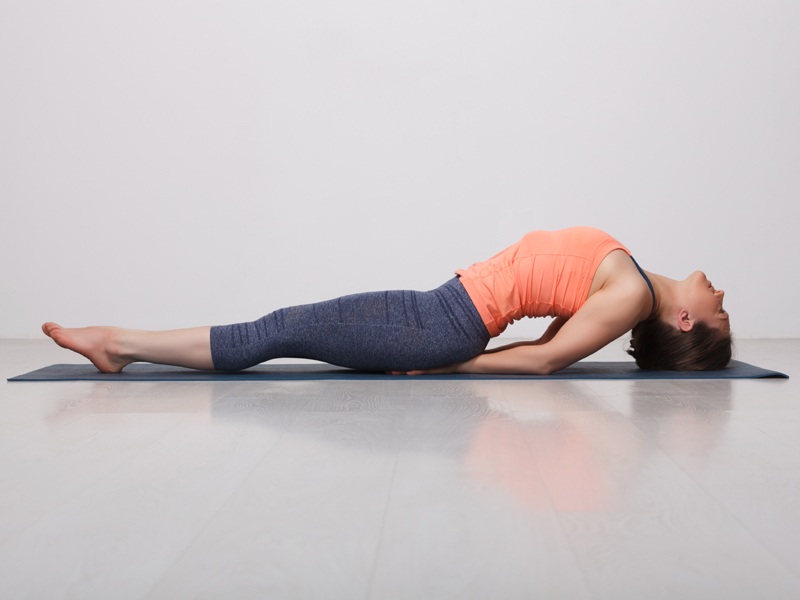 Lie on your back. your feet are together and hands relax alongside the body. Place the hands underneath the hips. Bring the elbows closer. breathing in, lift the head and chest up. keeping the chest elevated, lower the head backwards and touch the top of the head to the floor. press the elbows firmly into the ground placing the weight on the elbow and not on the head. lift your chest up. press the thighs and legs to the floor. hold the pose for as long as you comfortable can taking gentle long breeds in an out. relax in the posture with very exhilaration. now lift the head up, lowering the chest and head to the floor. bring the hands back along the sides of the body and relax.